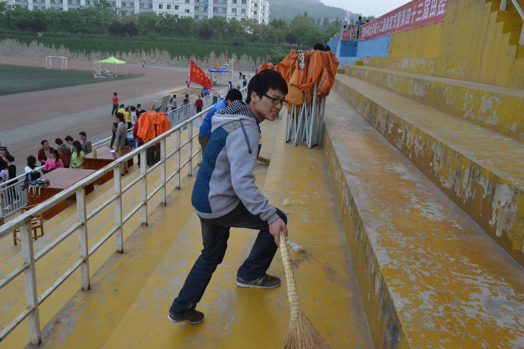 为了增强大学生参加的公益活动的意识,弘扬志愿者精神,培养吃苦耐劳品质,4月24日下午,在我校24日的运动会赛事结束后,新葡官网组织部分学生做了义务劳动。参加义务劳动的同学等观众台上的人员全部撤离后,迅速清理台上台下的垃圾,使田径场在短短的几分钟内变得异常干净。