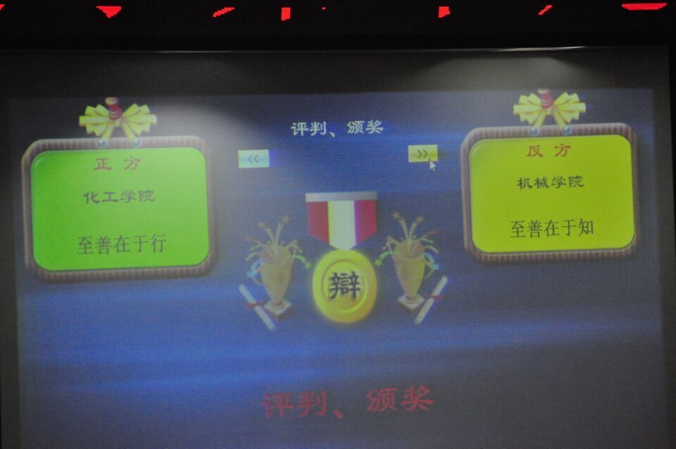 决赛中,辩论主题为“至善在于行还是知”,分为各方观点陈述、相互提问和自由辩论三个环节。担任正方的是化工学院代表队,担任反方的是新葡官网代表队,所持观点为“至善在于知”。新葡官网由2015级井天智、李阳、王师煜、邢迎光、李腾腾同学组成代表队在比赛中引经据典、旁征博引,经过激烈的辩论最终获得第一名。