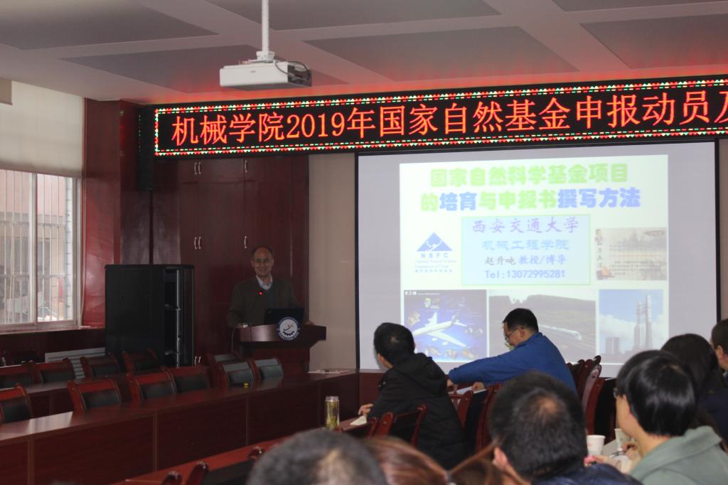 为提升学院国家自然科学基金的申请质量,有序推进2019年度基金申请工作,11月9日下午,3003新葡官方网站召开2019年国家自然科学基金申报动员会,并特邀国务院政府特殊津贴获得者、西安交通大学博士生导师、全国首届优秀百篇博士论文获得者赵升吨教授来校做了题为《国家基金项目培育与申报书撰写技巧》辅导讲座。80余名师生聆听了讲座,会议由副院长寇发荣主持。