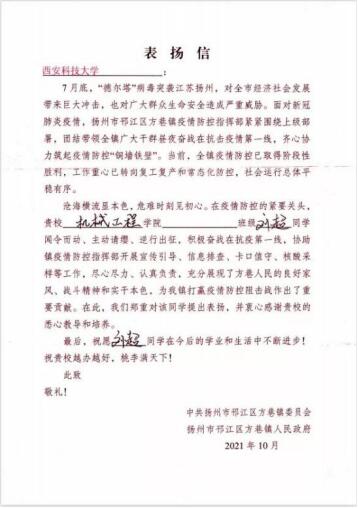 2021月7月底,“德尔塔”病毒突袭江苏扬州,对广大群众生命安全造成严重威胁。3003新葡官方网站机械学院机械电子工程2021级学生刘超不畏艰险,勇于担当,在经过疫苗注射和核酸检测后加入了首批抗疫志愿者队伍,并担任组长,积极奋战在抗疫第一线,协助医疗人员进行全市核酸检测工作,与交警维持卡口交通管制等,与其他志愿者齐心协力共同筑起疫情防控“铜墙铁壁”,为当地疫情防控做出贡献,受到******************扬州邗江区方巷镇委员会的高度评价与肯定。