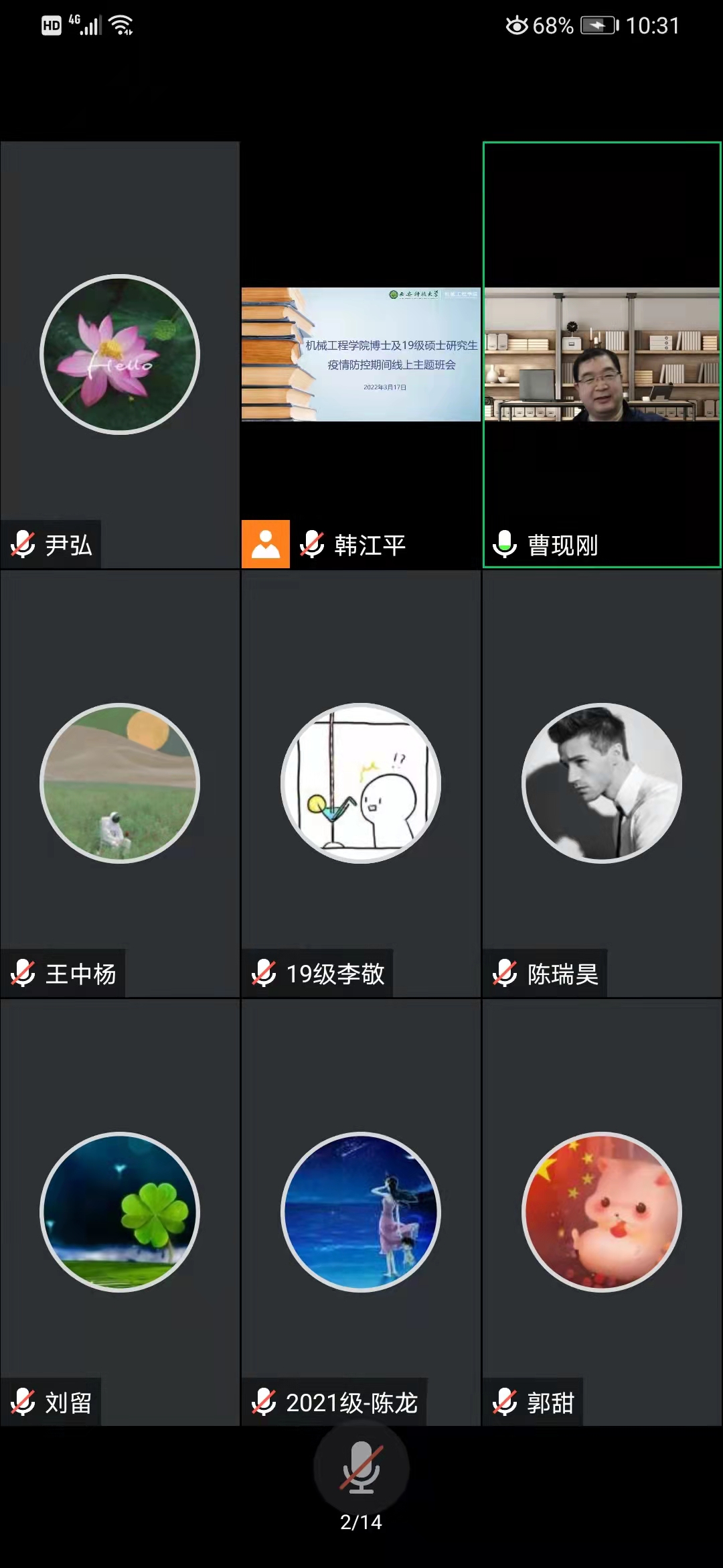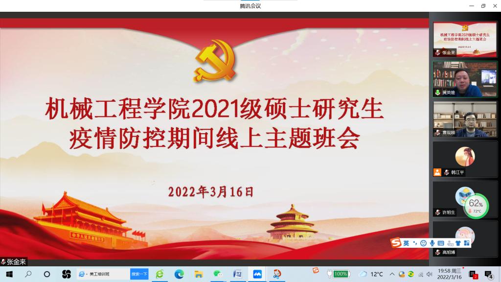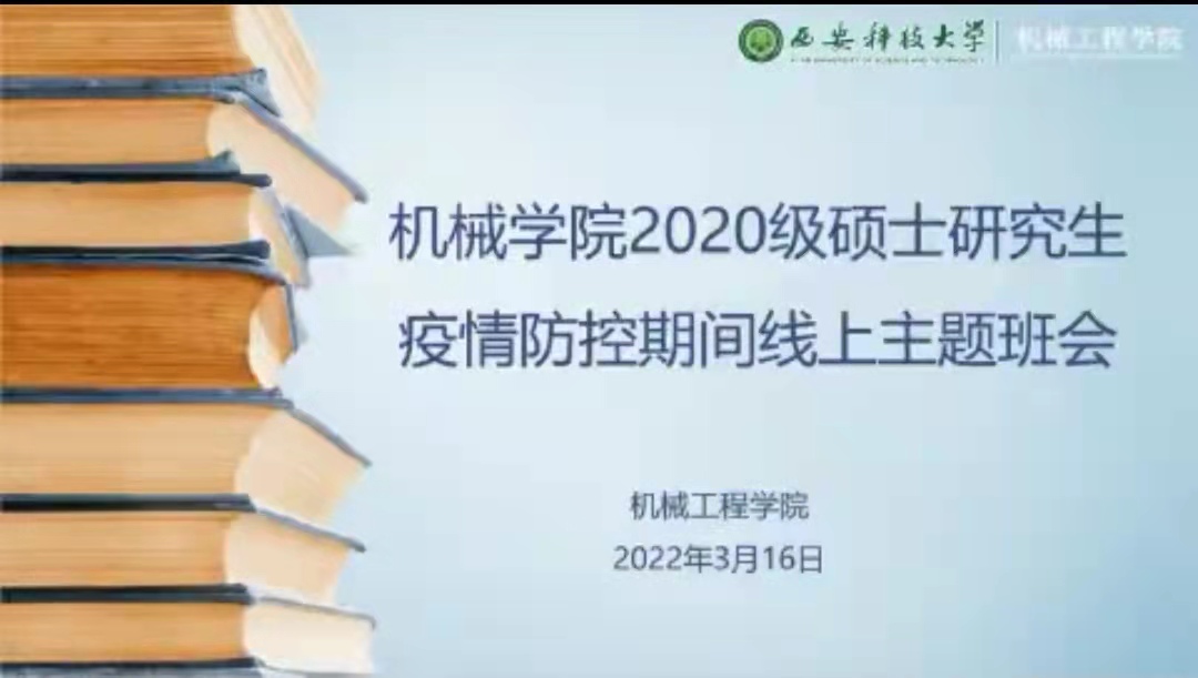 为进一步做好校园新冠肺炎疫情防控,增强雁塔校区研究生疫情防控的思想认识和行动自觉,积极推进研究生教育教学工作,3月16日至17日,机械学院以腾讯会议在线举行了硕士研究生、博士研究生疫情防控期间线上主题班会,副校长黄英维、机械学院党委书记张金来、副院长曹现刚、研究生辅导员以及全体研究生参加了主题班会。院党委副书记尹弘主持主题班会。