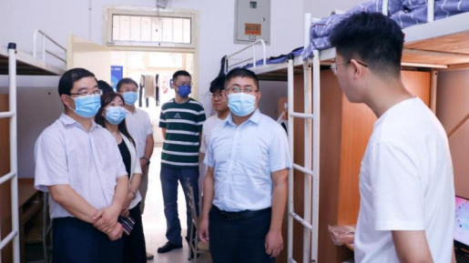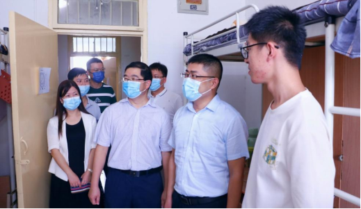 9月9日上午,3003新葡官方网站党委书记张金来、院长曹现刚、党委副书记尹弘、副院长钟斌、学生办公室主任周学刚及新生辅导员老师一行到9号学生公寓看望慰问2022级新同学。