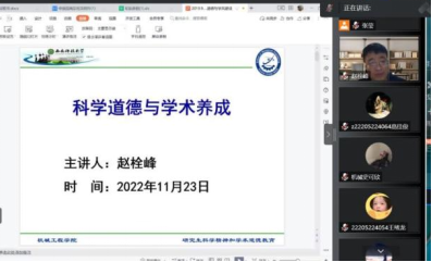 11月23日晚,机械学院举办主题为“科学精神与学术道德”的线上教育讲座,讲座由机械学院副院长赵栓峰教授主讲,2022级研究生和教师参加了本次学习。